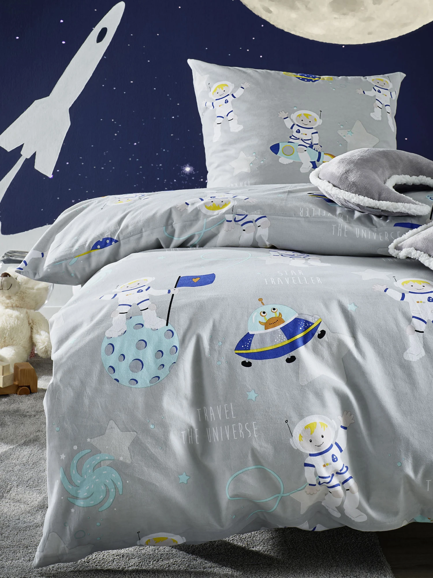 Kuschelig weiche und besonders hautsympathische Bettwäsche im coolen Weltraumdesign für kleine Astronauten. Aus reiner Baumwolle in Renforcé-Qualität. Das Gewebe ist gepeached. Zertifiziert nach Oeko-Tex Standard 100. Mit Qualitäts-Reißverschluss.