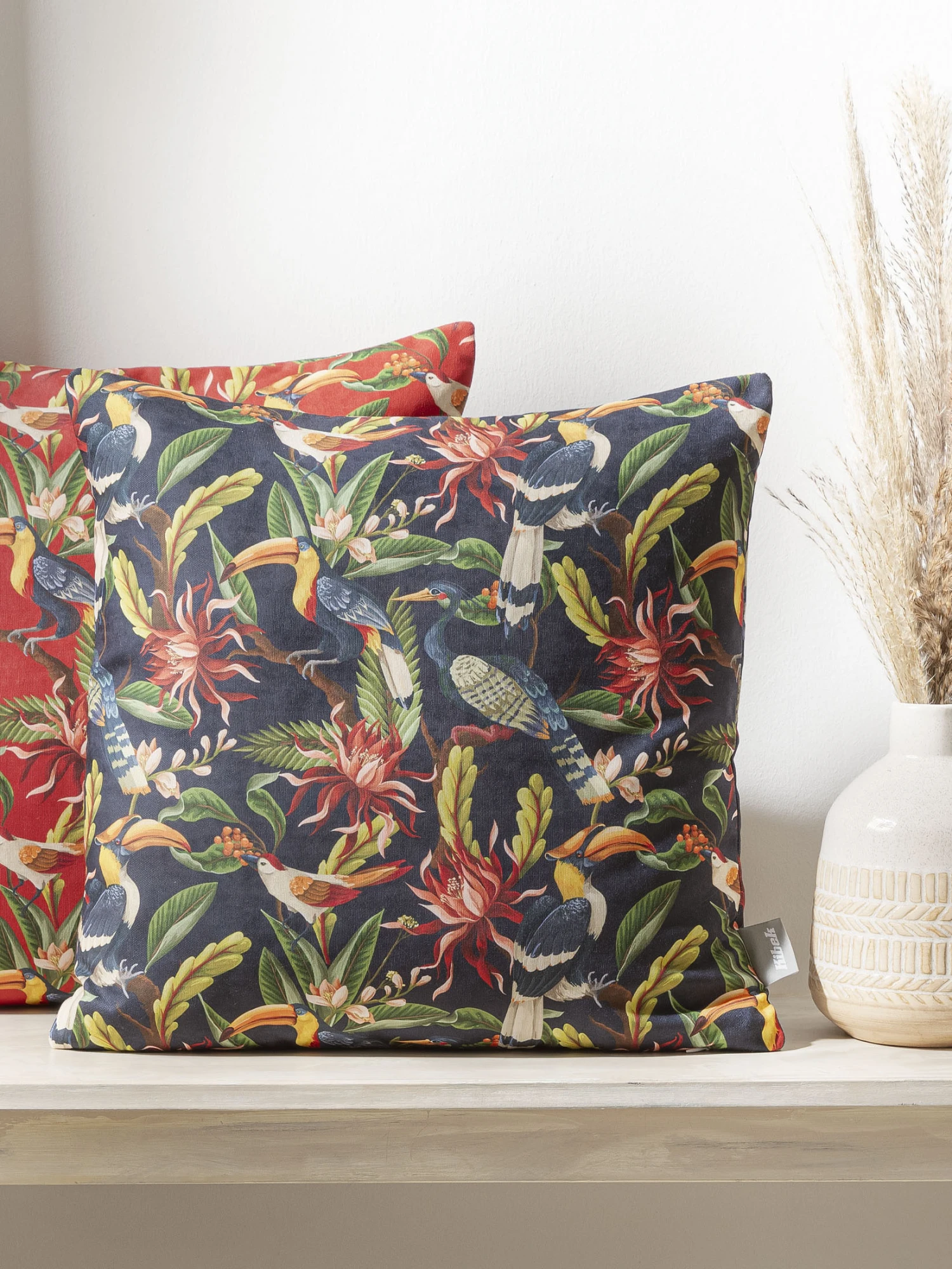 Ein Wohnaccessoire der außergewöhnlichen Art mit exotisch-botanischem Print. Mit Reißverschluss und Füllung. 100 % Polyester. Oeko-Tex Standard 100.
