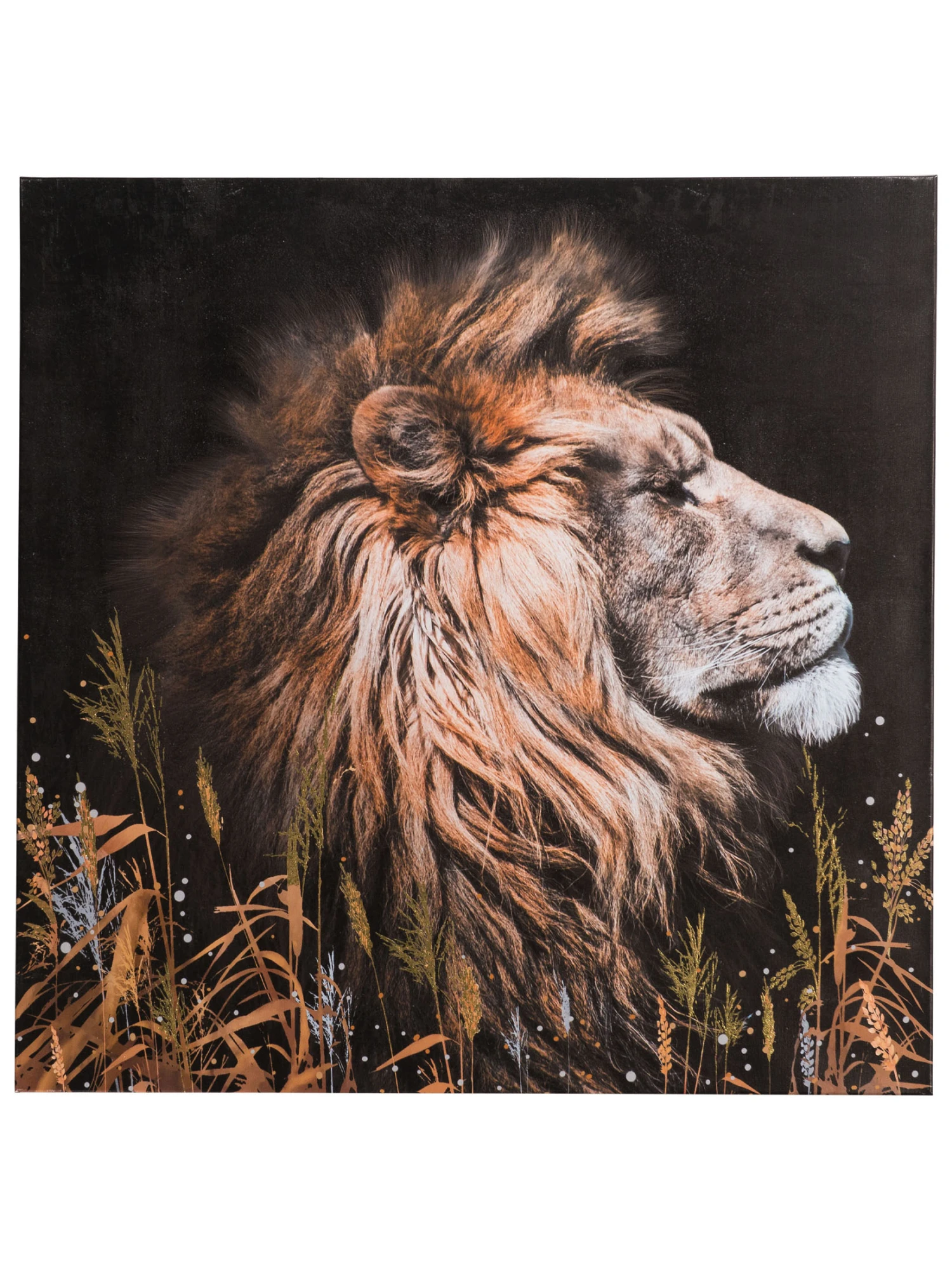 Majestätisches Löwen-Motiv vor dunklem Hintergrund auf Leinwand. Gras aus Goldfolie.