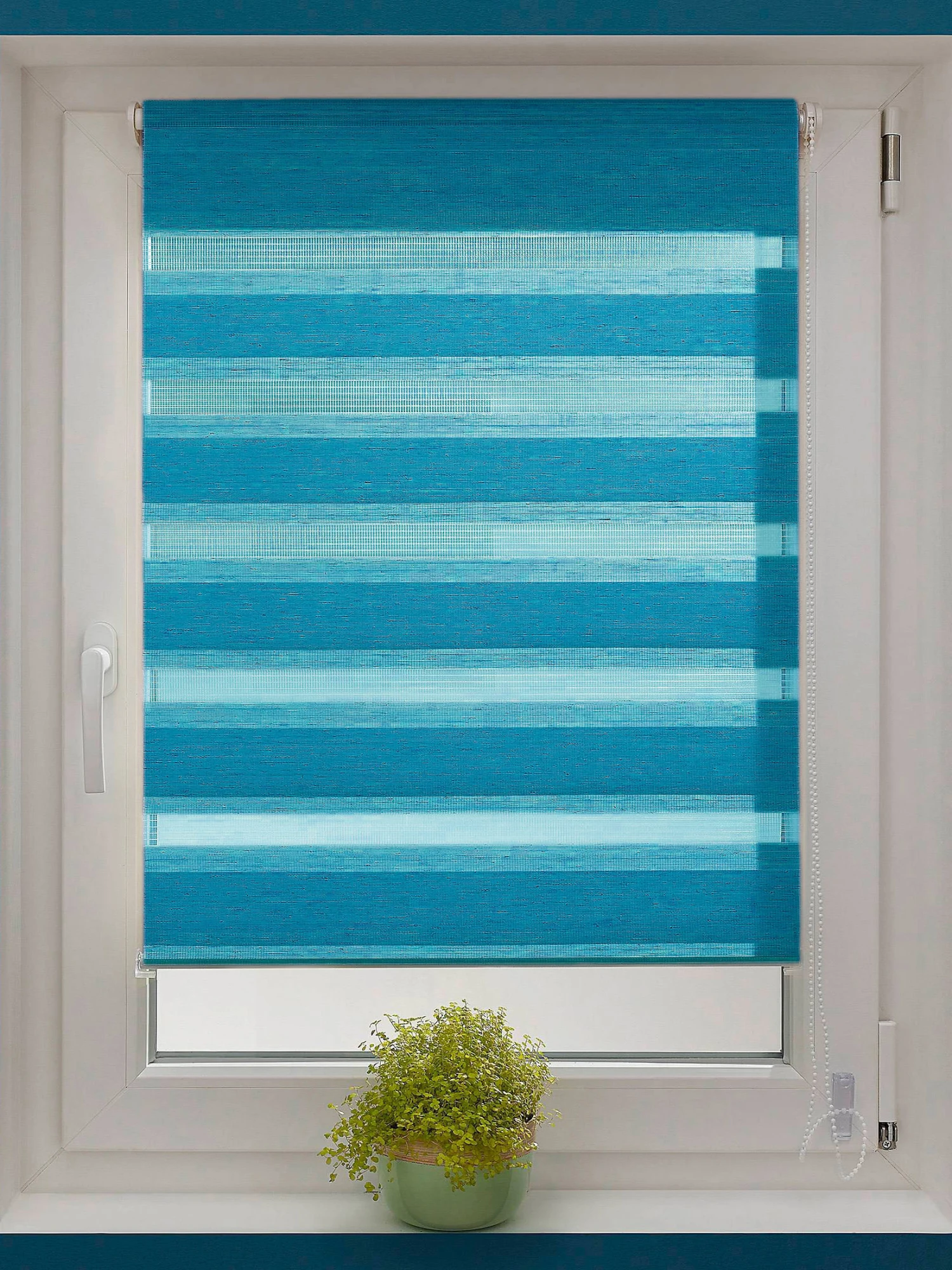 Beim DUO STARLIGHT liegen zwei Stoffbahnen übereinander, die wiederum transluzente und blickdichte Streifen haben. Je nach Stellung der Bahnen zueinander können Sie den Lichteinfall regulieren. Hierzu bedienen Sie ganz einfach den Kettenzug. Für die bohrfreie Montage am Fensterrahmen werden praktische Klemmträger mitgeliefert. Zusätzlich sind Clips für die Deckenmontage im Lieferumfang enthalten.