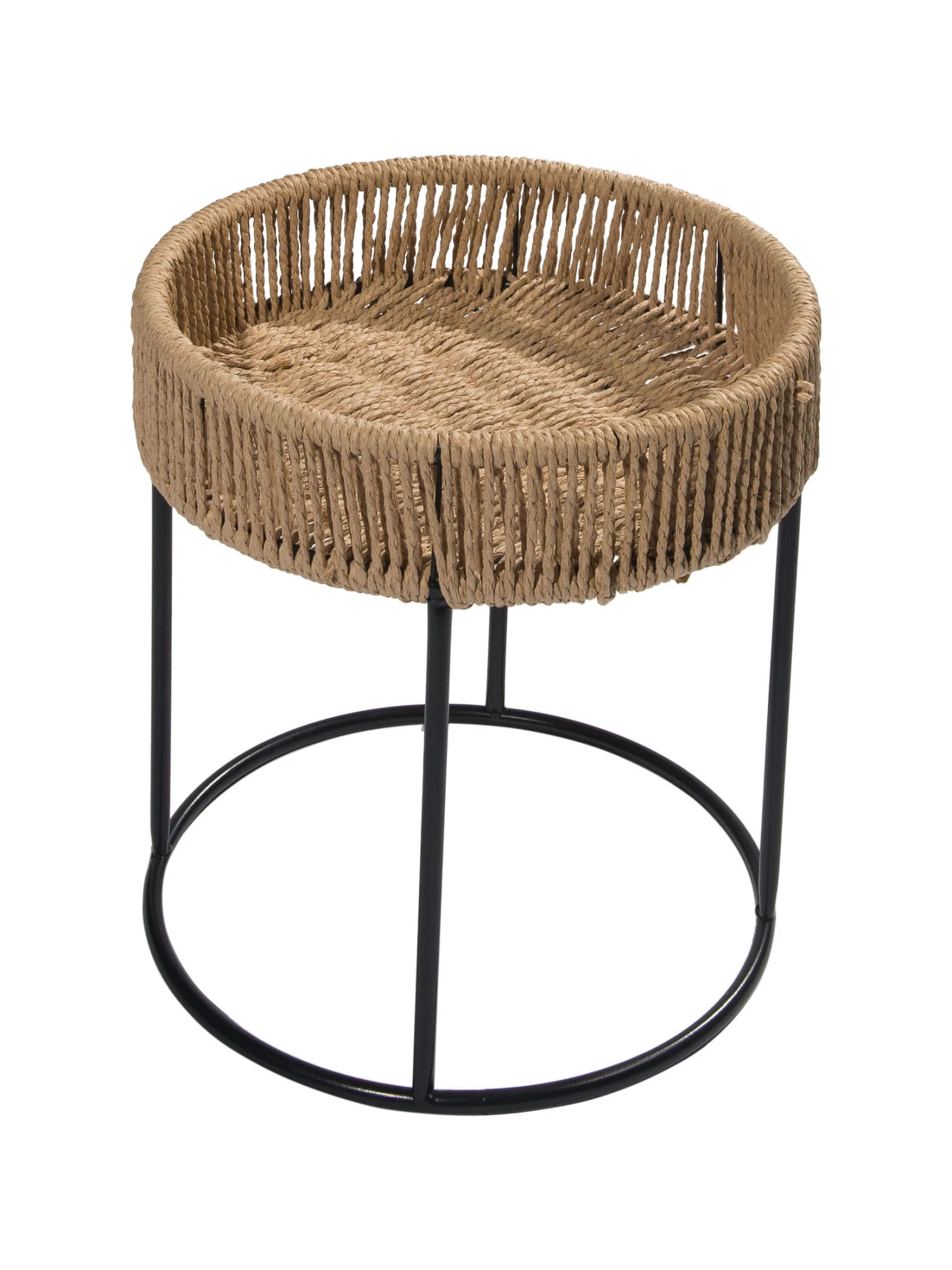 Kleiner aber feiner Boho-Beistelltisch aus Jute und Metall gefertigt.